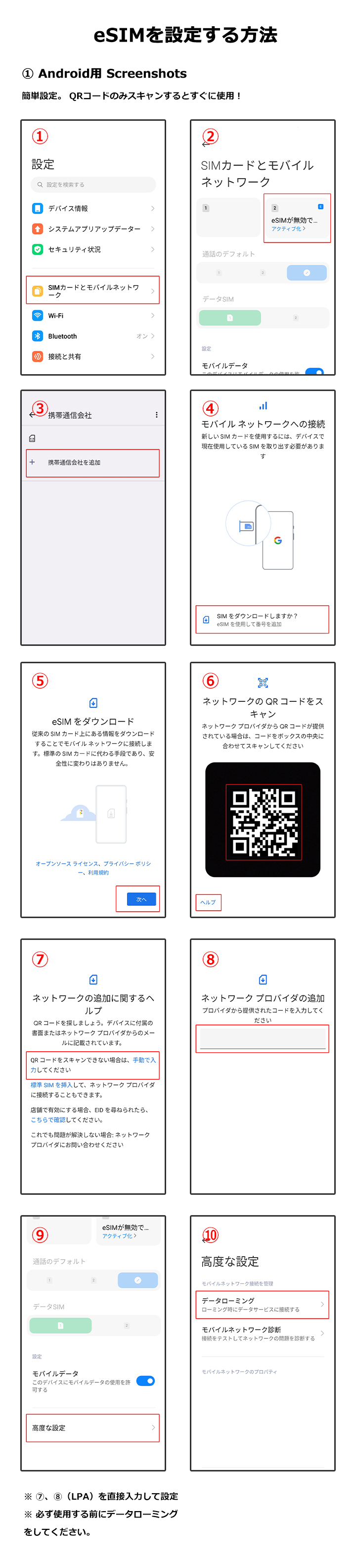 ※手動入力 : 設定 → ネットワークとインターネット → SIM → eSIMを追加 → アクティベーションコード入力 → LPA 情報入力 → データローミング「オン」